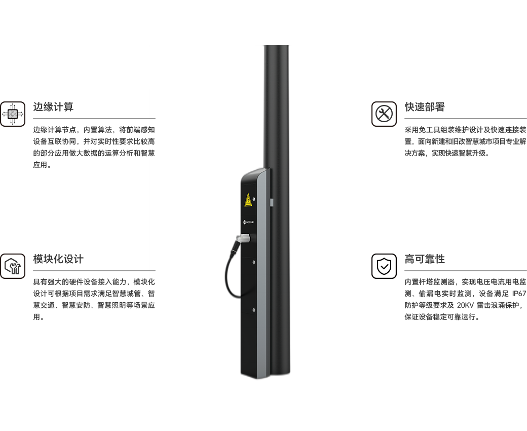 i·box智盒是勤上針對智慧城市舊改項目推出的帶邊緣運算能力的外置獨立智慧盒,其結構獨立,内置邊緣計算網關,傳統燈杆通過外加智盒就可以快速升級爲智慧燈杆,還可配置手機充電、汽車充電樁、一鍵報警等智慧功能。适用于圓杆、方形杆、内滑槽杆、外滑槽杆安裝等類型路燈杆。